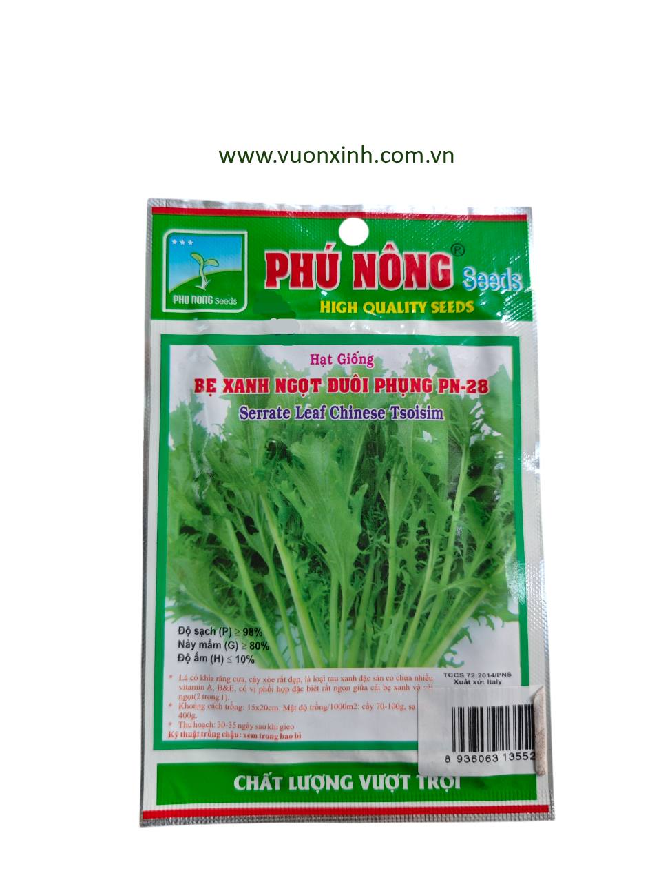 Mô tả: Hạt giống cải bẹ xanh đuôi phụng có khả năng sinh trưởng mạnh, hạt nảy mầm cao và sinh trưởng đồng đều. Thời gian thu hoạch 30 – 35 ngày sau khi gieo trồng. Vụ chính Đông Xuân (Miền Nam). Cải bẹ xanh có lá có khía răng cưa, cây xòe rât đẹp, lá loại rau xanh đặc sản có chứa nhiều vitamin A,B&E.