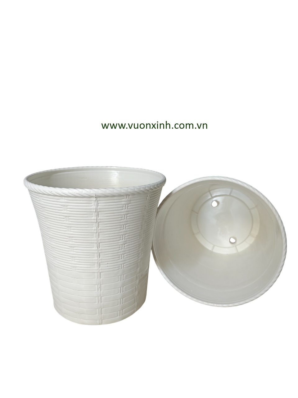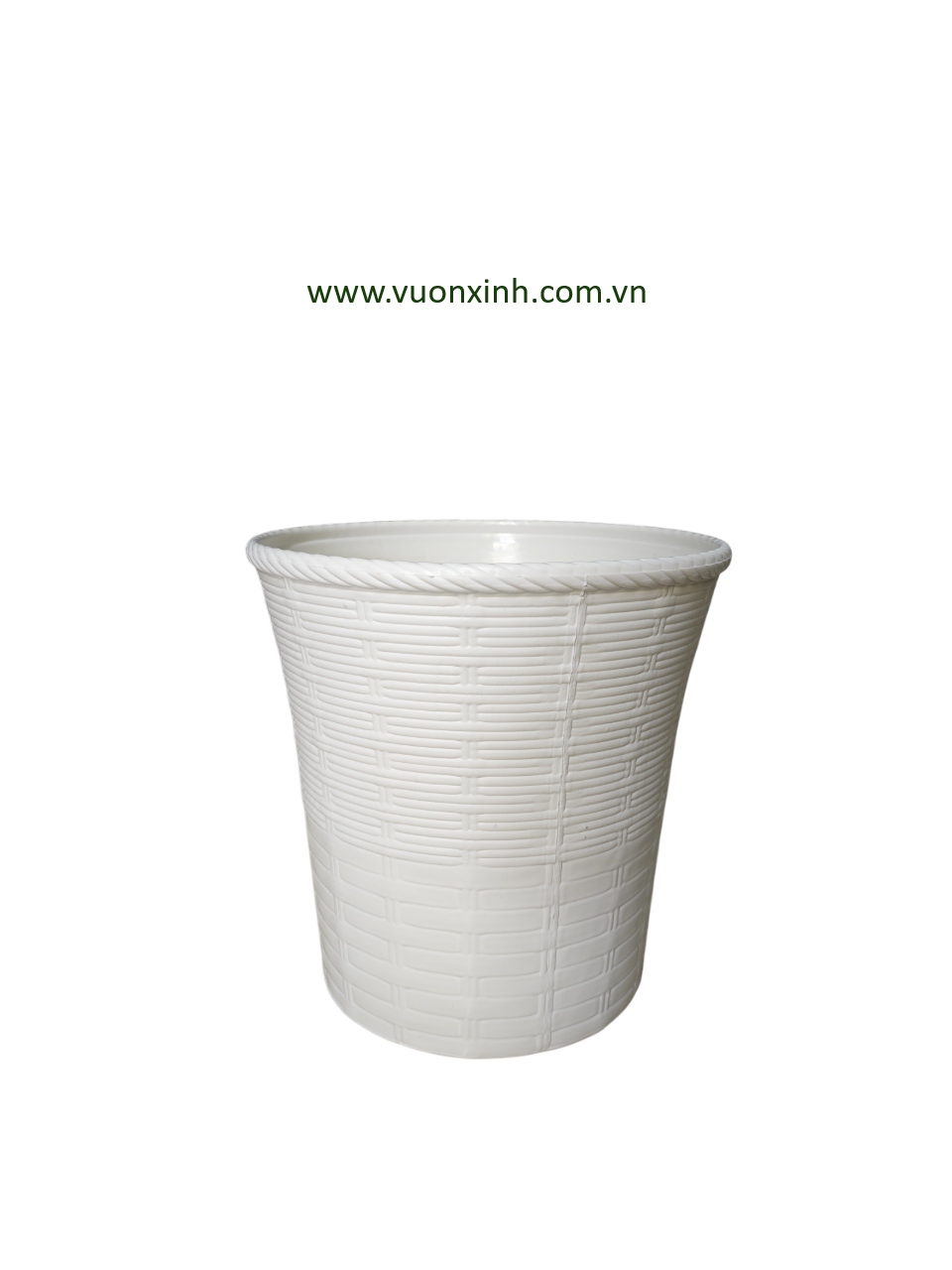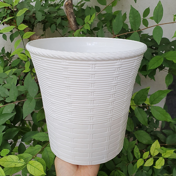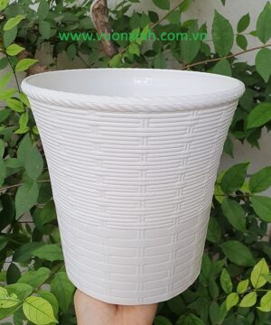 Chậu tròn kiểu mây đan hai lớp có thiết kế đơn giản mà sang trọng, sắc trắng trang nhã, phù hợp cho đa dạng các loại hoa kiểng, tạo mảng xanh tươi mát, dễ chịu cho gian nhà.