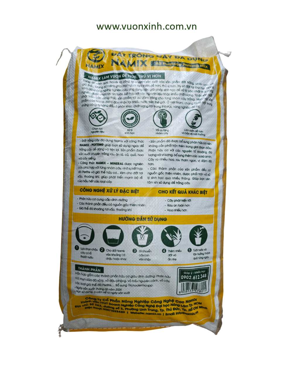 - Công nghệ NAMIX – NATURAL đảm bảo các thành phần chính của sản phẩm đều có nguồn gốc hữu cơ: phân compost, đá perlite, mùn dừa, vỏ trấu nguyên cánh, vỏ cây… Bạn yên tâm khi sử dụng để trồng rau sạch và an toàn. Đất trồng đa dụng Namix phù hợp trồng cây rau ăn lá, cây ăn trái, ăn củ và một số loại hoa ngắn ngày ngay tại nhà.