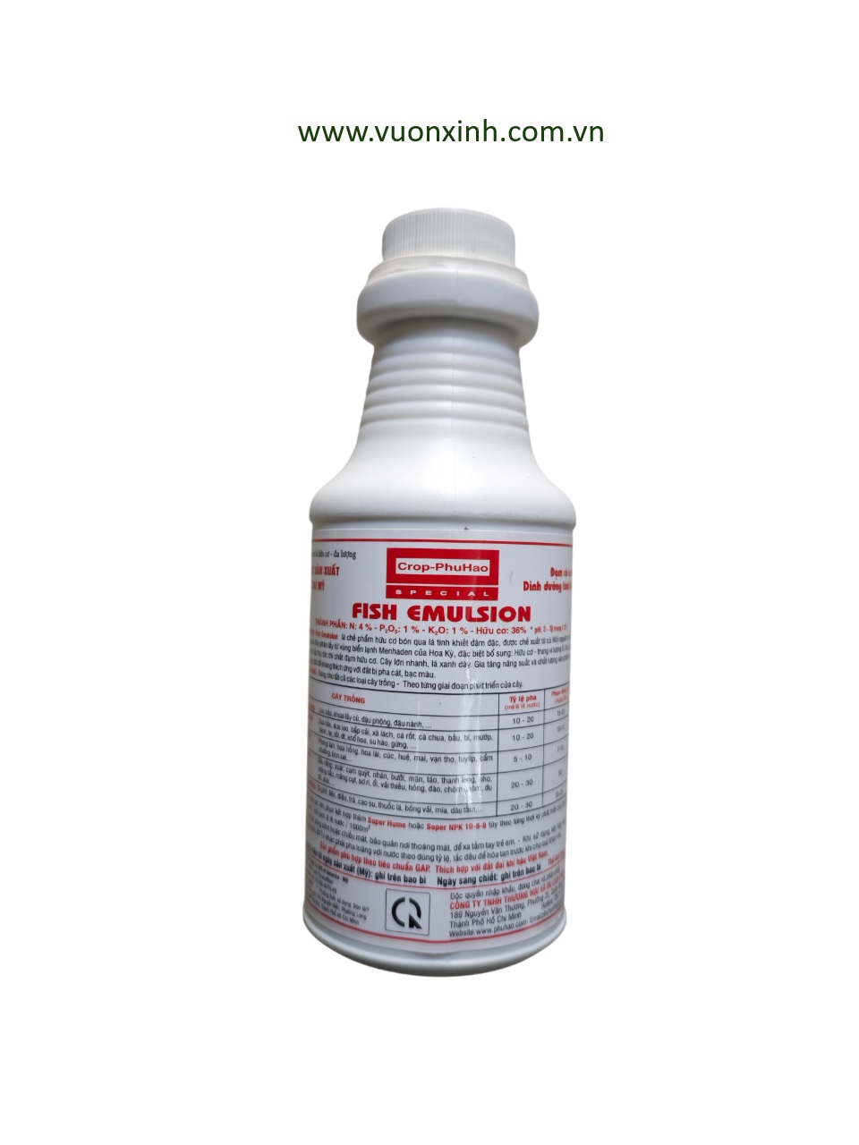 Fish Emulsion là chế phẩm tinh khiết đậm đặc, được chiếc xuất từ cá Mòi nguyên con bằng phương pháp thủy phân lấy từ vùng biển lạnh Menhaden của Hoa Kỳ, giúp cây hấp thụ tức thì chất đạm hữu cơ. Cây lớn nhanh, lá xanh dày. Gia tăng năng suất và chất lượng sản phẩm sau thu hoạch. Cải tạo đất xấu, đất pha cát và đẩt bạc màu