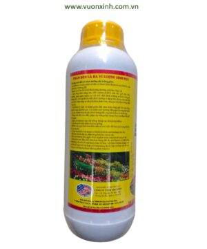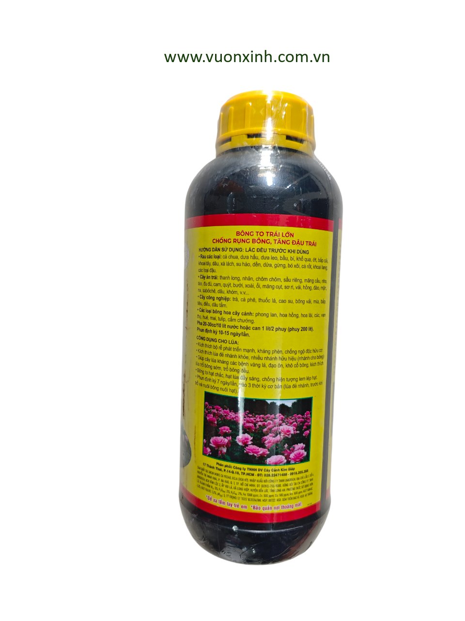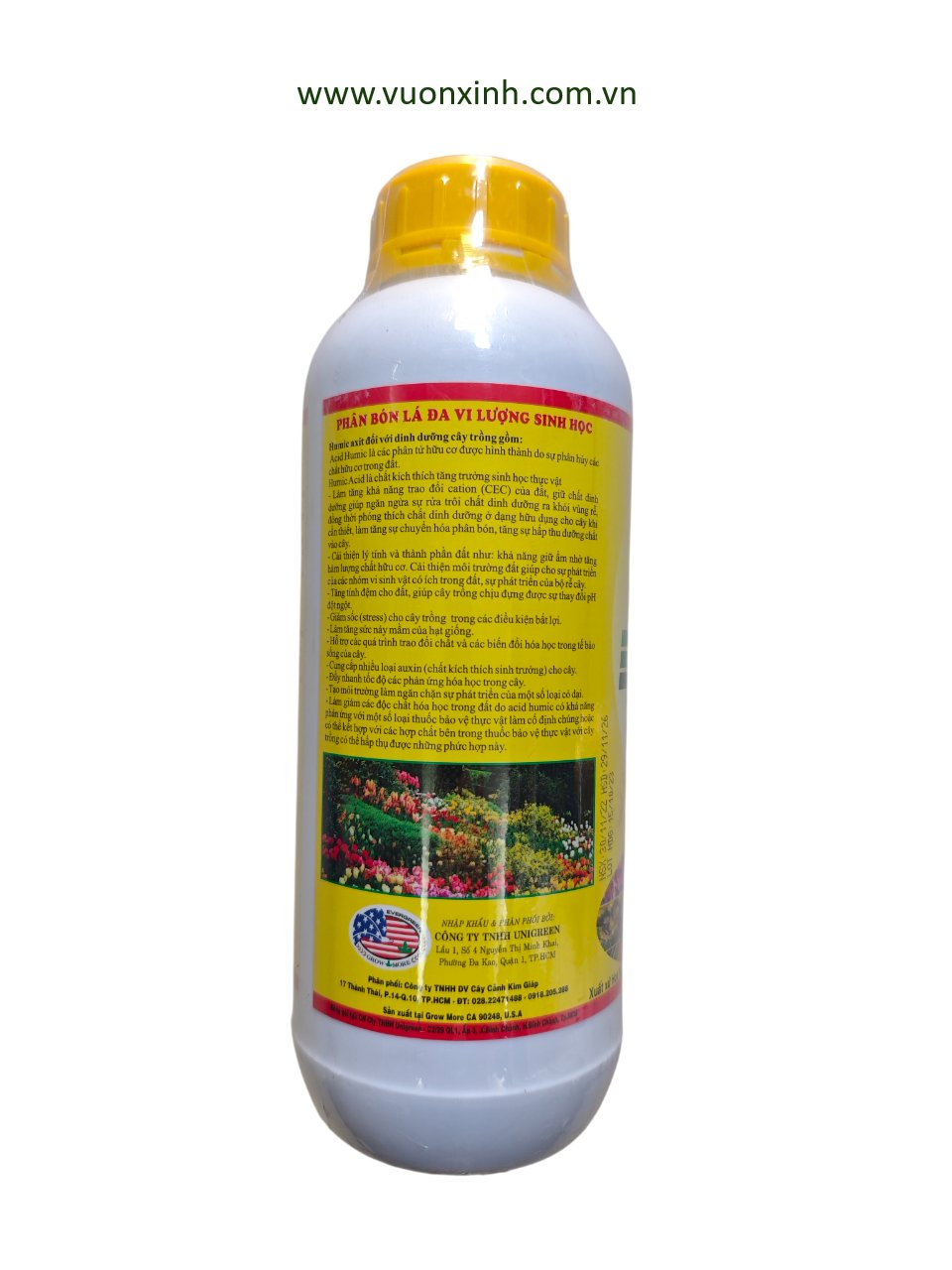 THÀNH PHẦN : + Nts : 3% , P2O5hh : 2% , K2Ohh : 2% , acid humic : 6.3% , axit fulvic : 1.2% , + Fe : 1000 ppm , Zn : 500ppm, Cu : 500 ppm , Mn : 500ppm, pH : 5, tỷ trọng : 1.1