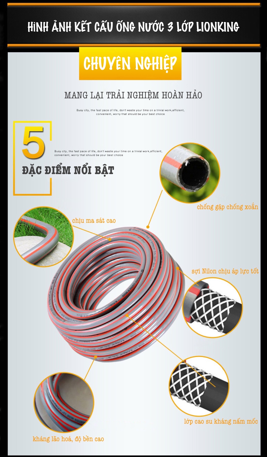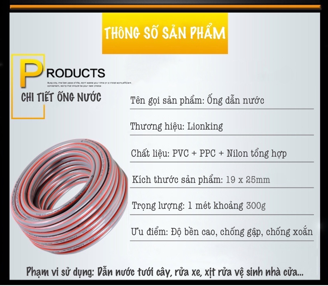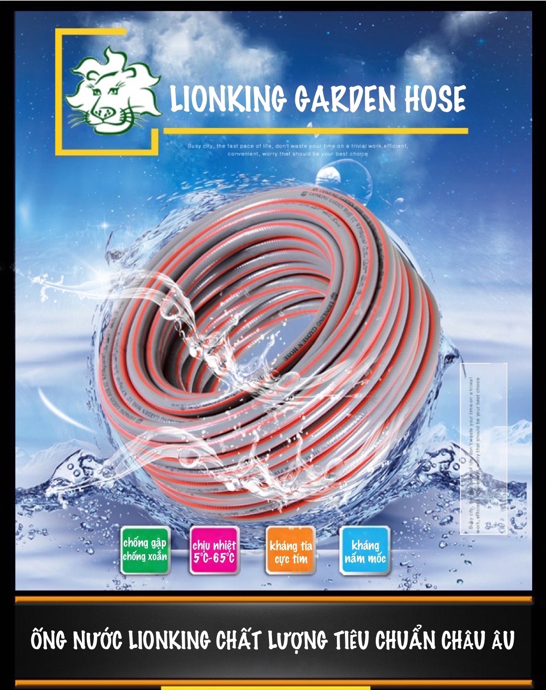 Ống dẫn nước Lionking GS19 được sản xuất bằng công nghệ của Châu Âu. Có kết cấu 3 lớp, không bị gập, không bị xoắn trong quá trình sử dụng. Lực chịu áp 20-25kg. Có khả năng chịu được ma sát cao, chịu được sự khắc nghiệt của thời tiết. Sử dụng ổn định trong khoảng nhiệt độ từ -5C° đến 65C°. Dùng để tưới cây, rửa xe, xịt rửa vệ sinh nhà cửa…