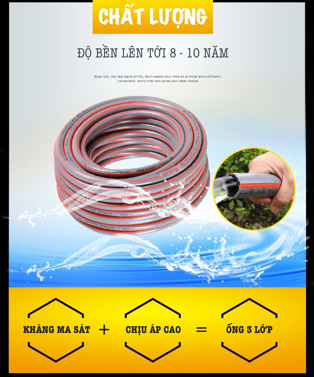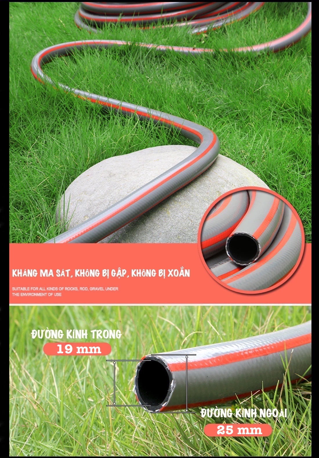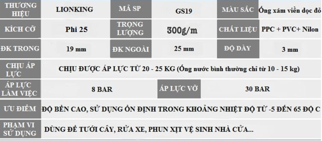 Ống dẫn nước Lionking GS19 được sản xuất bằng công nghệ của Châu Âu. Có kết cấu 3 lớp, không bị gập, không bị xoắn trong quá trình sử dụng. Lực chịu áp 20-25kg. Có khả năng chịu được ma sát cao, chịu được sự khắc nghiệt của thời tiết. Sử dụng ổn định trong khoảng nhiệt độ từ -5C° đến 65C°. Dùng để tưới cây, rửa xe, xịt rửa vệ sinh nhà cửa…