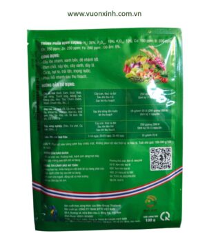 Nts: 30%; P2O5hh: 10%; K2Ohh: 10%; Zn: 250 ppm; Fe: 280 ppm; Cu: 100 ppm; B: 200 ppm; Mn: 350 ppm; Độ ẩm: 5%