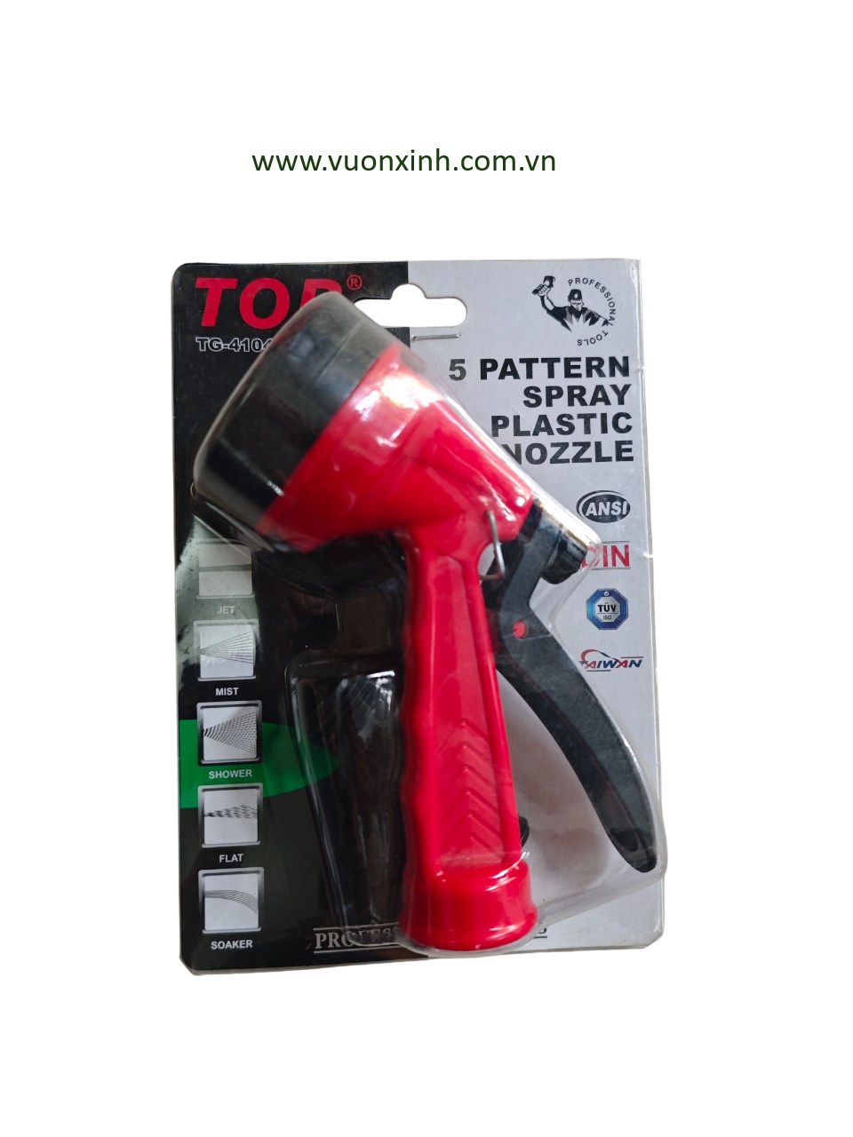 Vòi phun nước tưới cây và rửa xe 5 tia TOP rất thích hợp để sử dụng trong vườn nhà bạn, sản phẩm được thiết kế theo dạng súng nhầm mục đích tạo sự thuận lợi cho người dùng có thể phun nước liên tục hoặc tạm ngưng nhưng không cần phải khóa nguồn nước